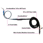 The FreedomDrive's back-end is compatible with all major welding machine manufacturers, while the front-end interfaces with FreedomDrive specific AT/WT guns.