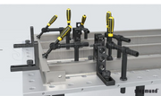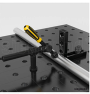 To safely fasten different welding parts, the prisms are interchangeable. To integrate the vertical pipe into the system bore holes, an adjusting ring is used (Item No. 2-280653). As a standard feature, the Round Pipe Clamp Universal is equipped with a 135mm threaded arbor.